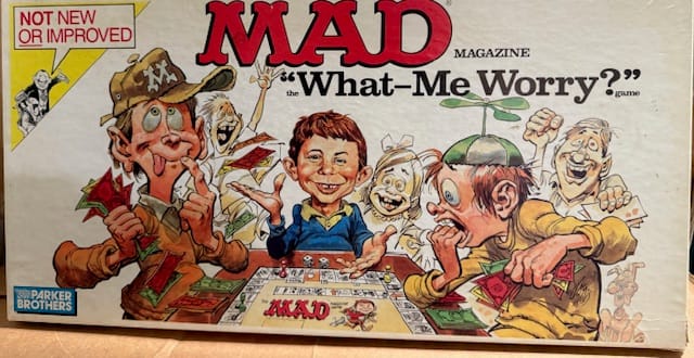 Our family likes to play board games. We played them with our kids and now we play them with our Grandkids. A favorite is little known: The Mad Magazine "What-Me Worry?" Game. Boomers and some from Gen X probably remember Mad Magazine, which at its height in the 1960s was the paragon of satire in comics. The 1979 game is less well known but it kept to the Mad spirit. It was basically the anti-board game board game. It made fun of Monopoly, in particular. Which is even funnier when you consider both games come from Parker Brothers.