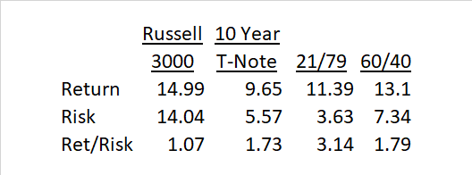 The chart also shows a balanced portfolio of 21% stocks and 79% bonds. This is a typical low risk portfolio for retirees and splits risk (as defined by standard deviation) between stocks and bonds. The table below shows this balanced portfolio having a much higher Sharpe ratio than either stocks or bonds. The traditional 60/40 portfolio also has a higher return/risk ratio than either asset separately. While this analysis is on the US, other developed markets show very similar patterns.